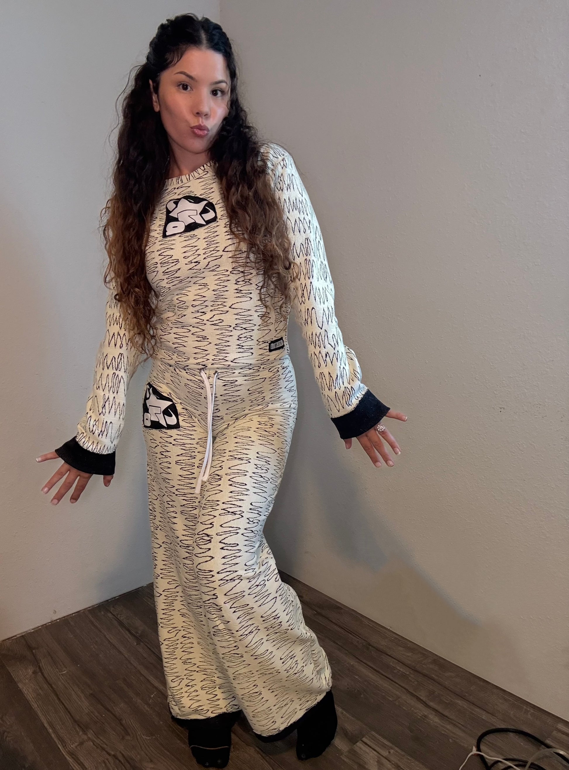 Elevate your loungewear with this cozy set, this handmade two-piece set features a matching long sleeve top and wide-leg pants. The cream base is detailed with an abstract black wave pattern throughout, giving it an effortlessly bold, graphic look.